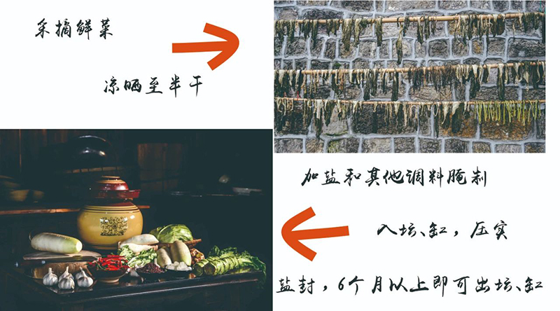 傳統(tǒng)的加工流程大致是這樣的,采摘鮮菜——涼曬至半干,加鹽和其他調(diào)料腌制,入壇(缸)壓實——鹽封,6個月以上即可出壇(缸)。雖然加工流程差不多的,但是各地的冬菜所采用的主要原料、蔬菜的品種是不一樣的,所加入的調(diào)味料也是千差萬別,因此就形成了風味不同的冬菜。