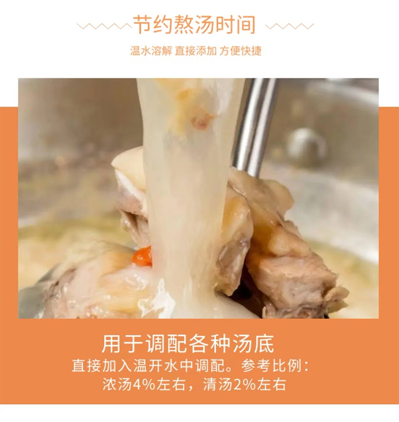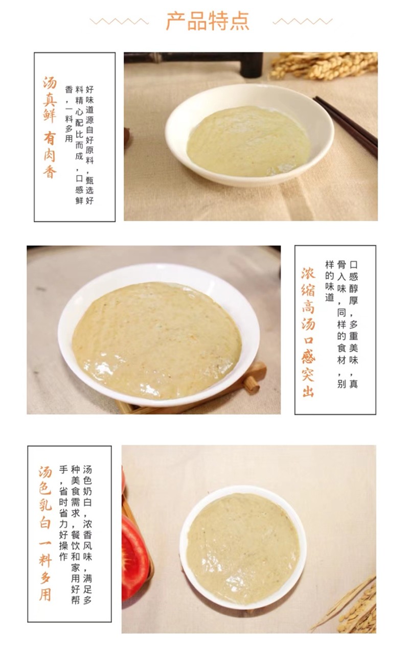 湯滋寶采用豬骨、雞骨、豬肉、雞肉、雞油、洋蔥、配比一定的香辛料熬制而成,具有自然而醇厚的滋味,是不可多得的鮮美好調(diào)料。無論你是做湯鍋,湯菜還是米線面食小吃,打湯底選擇西府順?biāo)疁虒氁欢ú粫e!